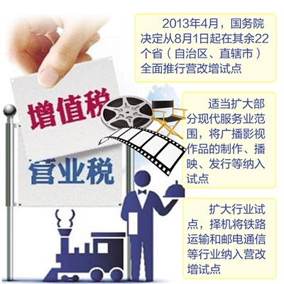 2013年4月,国务院决定从8月1日起在其余22个省(区、市)全面推行营改增试点。一是扩大地区试点,将交通运输业和部分现代服务业“营改增”试点在全国范围内推开,适当扩大部分现代服务业范围,将广播影视作品的制作、播映、发行等纳入试点。二是扩大行业试点,择机将铁路运输和邮电通信等行业纳入试点