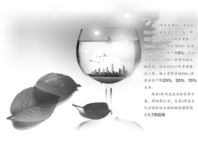 从PM2.5的治理目标来看,去年年底发布的《重点区域大气污染防治“十二五”规划》提出,到2015年京津冀、长三角、珠三角区域PM2.5浓度下降要比2010年下降6%;而此次发布的《计划》则将目标大幅提高,提出到2017年京津冀、长三角、珠三角等区域PM2.5浓度分别下降25%、20%、15%左右。