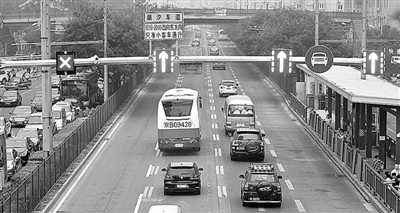 9月12日晚高峰,北京朝阳路启用潮汐车道。 本报记者 赵 晶摄