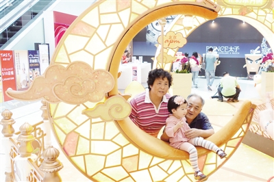 | 9月19日,北京新东安市场,寓意团圆的月亮布景吸引了前来购物的市民拍照留念。中秋佳节,北京各大商场装饰一新,节日气氛浓烈。 |