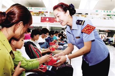 | 9月19日,沈阳铁路局大连站值班站长张妮将写有祝福话语的中秋月饼,送到即将回家团圆的旅客手中。 |