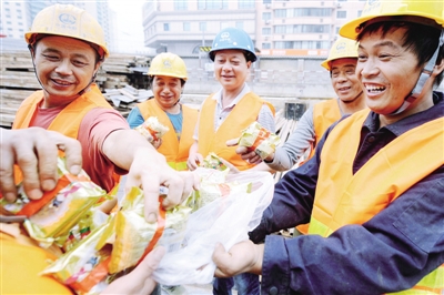 | 9月19日,北京地铁15号线安立路站施工区,奋战在节日岗位上的中铁隧道集团的员工分享月饼,感受关怀。 |