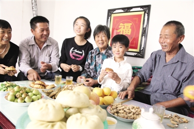 | 9月19日,山东省沾化县下洼镇西贾村,王景泉(左二)一家人的团圆饭虽然简单,却透着浓浓的亲情。 |