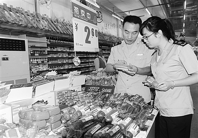 “两节”期间,山东省枣庄市峄城区组织工商、食品药品安监等单位对商场超市、集贸市场等开展拉网式检查,严厉打击销售假冒伪劣食品行为。图为工商人员在超市进行执法检查。 孙启路摄