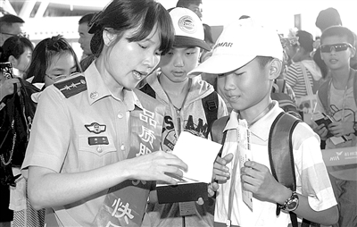 近日,杭州边检站为驻地50余名小学师生举行警营开放日活动,让学生切身感受边检官兵的工作生活情况。图为杭州边检站检查员在为小学生讲解出入境手续办理流程。范加龙摄