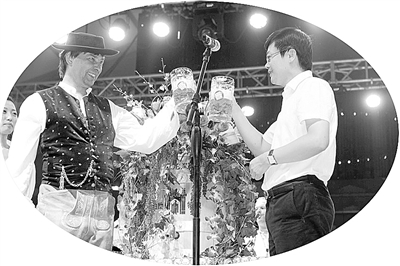 北京市文资办主任周茂非与德方慕尼黑副市长先生的特使奥利弗·贝里克共同为“慕尼黑国际啤酒节”北京之旅揭幕。