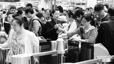 9月30日,北京南站客流量明显增多,旅客正在有序进站乘车。据了解,国庆黄金周期间,全国铁路预计发送旅客8100万人,同比增加573万人,日均发送810万人,增长10.9%。 本报记者 李树贵摄