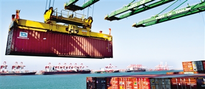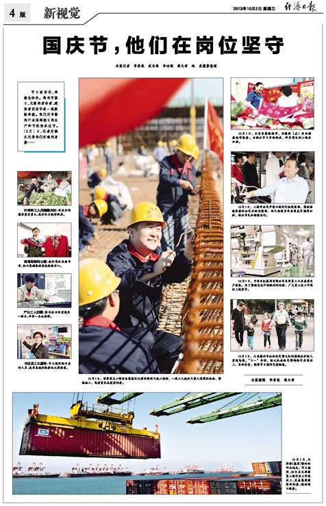 | 10月1日,天津港(集团)繁忙的作业码头。节日期间,近万名天津港员工坚守在工作岗位上,完成集装箱装卸任务,做好港口服务。 |