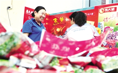 | 10月1日,北京京客隆超市,刘慧铭(左)在为顾客热情服务。为保证节日市场供应,许多商业职工都在加班。 |