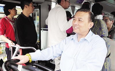 | 10月1日,上海市公交申崇六线的司机周金福,驾驶满载乘客的公交车驶向崇明,他已连续多年在国庆节期间加班,保证市民和游客出行。 |