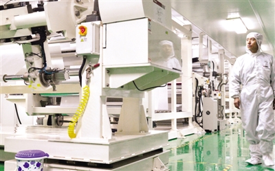 | 10月1日,中国乐凯集团有限公司车间员工正在查看生产设备。为了圆满完成印刷版材的任务,广大员工在工作岗位上过佳节。 |