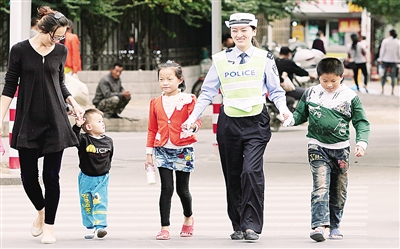 | 10月1日,山东滕州市公安局交警大队的颜艳在护送儿童过马路。“十一”长假,该大队全体交警都坚守在岗位上,尽职尽责,保障节日期间交通畅通。 |