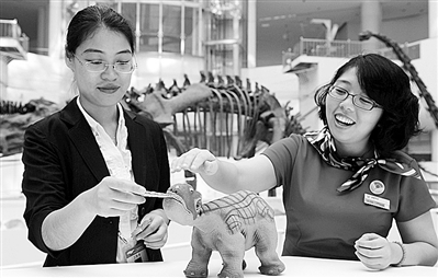 广东科学中心近日推出了“穿越侏罗纪”主题展,展出距今2.3亿至6500万年前的恐龙化石骨架14具,其中包括长达22米、亚洲目前最大最完整的恐龙化石,展览设置了与“恐龙”互动等高科技游戏。图为工作人员与智能恐龙宝宝互动。 新华社 刘大伟摄