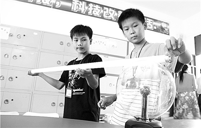 2012年底,广西岑溪市岑城镇第十小学建成乡村少年宫,开设绘画、合唱、科技等10多个兴趣小组和活动项目,丰富农村孩子的课余生活。图为孩子们在“快乐科技营”里感受“电离子魔法灯”的魅力。新华社 黄孝邦摄
