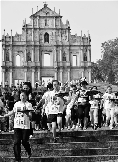 9月27日,参赛者在托盘比赛中。当日,为庆祝“世界旅游日”,澳门特区政府旅游局举行托盘比赛,起点是澳门大三巴牌坊,终点为澳门议事亭前地。 (新华社发)