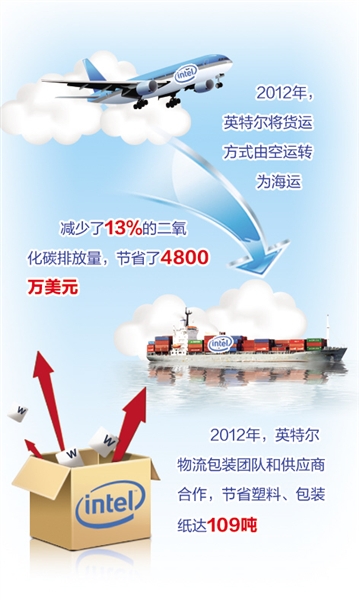 在可持续供应链生态之中,环境因素最为重要。这方面,英特尔同供应商开展环境管理领域的合作,致力于降低所有包装和运输方面的环境影响。英特尔全球环境总监托德·布拉德利告诉记者,在过去几年中,英特尔保持与电气电子工程师协会(IEEE)的合作研究,评估信息通信产业供应链的碳足迹及水足迹,加入其可持续发展工作组,建立新的碳报告系统,以减少整个电子行业供应链碳排放。“在2012年,英特尔为降低其物流供应商的负面环境影响,作出了更多努力。英特尔发现,将货运方式由空运转为海运,是最有效减排的方式。在2012年,这个转变让英特尔减少了13%的二氧化碳排放量,节省了4800万美元。”此外,英特尔物流包装团队在2012年和供应商合作,节省塑料、包装纸共计109吨,超过既定同比增长目标25%。英特尔还同两个供应商开发了一种新工艺,能将一种包装材料回收再利用,节省成本约75000美元。英特尔将节省的成本当作奖金奖励给了供应商。该工艺目前已在行业中快速推广,每年能够节省成本300万美元。