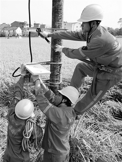 10月13日,浙江诸暨市供电局电力职工来到街亭镇周村水稻种植基地检修供电设备。浙江省进入水稻秋收时节,电力职工组成秋收保电服务队,深入田间地头,保障秋收秋种期间的安全用电。