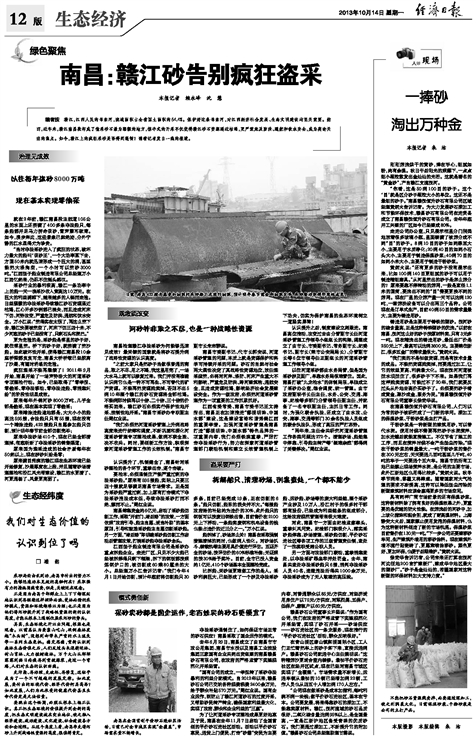 编者按 赣江,江西人民的母亲河,流域面积占全省国土面积的54.4%。保护好这条母亲河,对江西经济社会发展、生态文明建设均至关重要。然而,近年来,赣江南昌段却成了偷采砂石最为猖獗的地方,掠夺式的开采不仅使得赣江砂石资源逼近枯竭,更严重危及防洪、通航和饮水安全,成为舆论关注的焦点。如今,赣江上的疯狂采砂是否得到遏制?请看记者发自一线的报道。