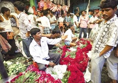日前,小贩在印度加尔各答市的鲜花市场卖花。印度加尔各答市10日迎来一年中最重要的节日——杜尔加女神节,以庆祝土地的肥沃和丰收。许多市民来到市场购买鲜花,用于祭祀和装点家庭。 (新华社发)