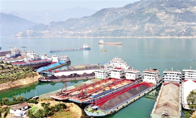 图为10月13日,船舶停靠在水位涨至170.01米时的三峡大坝上游湖北省秭归县沙湾水域等待过闸。
