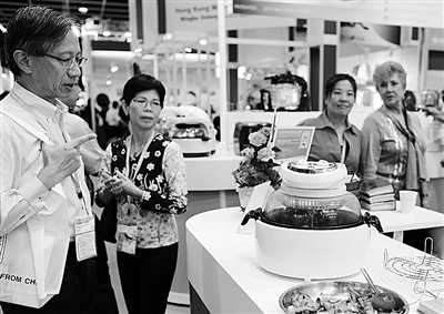 10月14日,几名客商在展会上观看一家台湾参展商展出的多功能烘焙炉。由香港贸易发展局主办的香港秋季电子产品展在香港会展中心举行。展览吸引30个国家和地区的逾4000家公司参展,设置超过5350个展位,打破历年纪录。 新华社记者 李 鹏摄