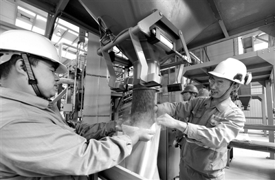 10月16日,太钢哈斯科钢渣综合利用公司当班工人在对生产出来的专用化肥进行包装。近日,由山西太钢集团和美国哈斯科公司共同投资建设的钢渣综合利用项目进入试生产阶段。太钢哈斯科钢渣综合利用项目是中国第一个、全球最大的钢渣综合利用项目。该项目于2012年3月底在山西阳曲县开工建设,总投资4.6亿元,年处理能力达150万吨。 张轩瑜摄 (新华社发)