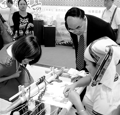 10月16日,市民在商品展上观看壮锦编织师编织壮锦。