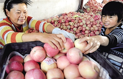 10月16日,山东省栖霞市蛇窝泊果品批发市场,果农正在装箱称重刚刚采摘的苹果。当日,第十二届中国·山东栖霞苹果节开幕。本次活动主题为“相约苹果之都 畅游甜美栖霞”。苹果节着力打造“苹果、旅游、文化”3大特色品牌,进一步开拓市场,构建苹果销售、文化交流和经贸合作平台。 本报记者 赵 晶摄