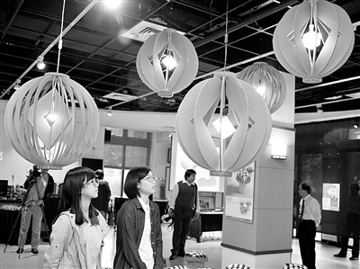 10月21日,参观者在台北科技大学艺文中心参观瓦楞纸灯饰。当日,在此地举行的瓦楞纸家具设计特展,展出了多件利用瓦楞纸制作的桌椅、灯饰等家居用品。瓦楞纸具有成本低、质量小、易加工、强度大等优点,80%以上的瓦楞纸均可通过回收再生。 吴景腾摄(新华社发)