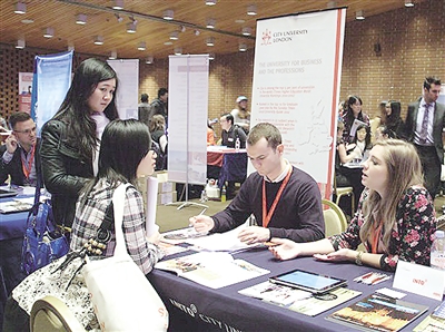 由英国海外留学生服务中心举办的伦敦教育展日前在伦敦开幕,吸引了50所英国顶尖名校参展。图为学生在咨询相关信息。 本报驻伦敦记者 王传宝摄