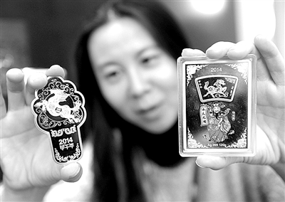 11月5日,工作人员展示2014年马年贺岁生肖系列产品。当日,由中国印钞造币总公司发行的马年贺岁生肖系列产品在北京菜百上市。 新华社发
