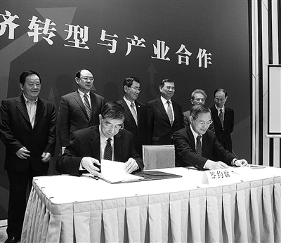 在两岸经济转型与产业合作专题论坛上,两岸代表签署了两岸产业合作工作机制备忘录。 本报记者 廉 丹摄