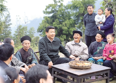 在湘西州花垣县排碧乡十八洞村,习近平到苗族贫困村民施齐文家中看望,坐下来同一家人算收支账,询问有什么困难、有什么打算,察看了他家的谷仓、床铺、灶房、猪圈,勉励一家人增强信心,在党和政府关心下用勤劳和智慧创造美好生活。
