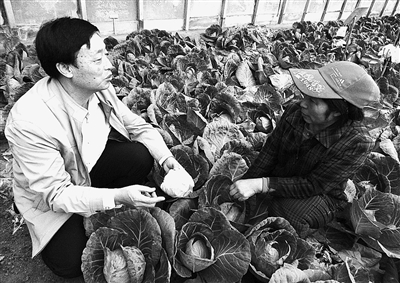 延庆县康庄镇的绿菜园合作社是一家在北京市率先推出“农宅对接”销售模式的企业,今年前10个月,绿菜园合作社销售有机蔬菜超过120吨。图为绿菜园合作社创始人赵玉忠(左)向承包蔬菜大棚的农民了解秋菜长势。 新华社记者 李 欣摄