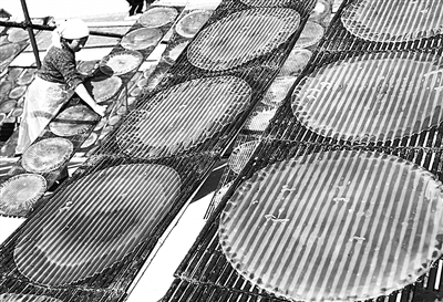11月12日,山东省淄博市沂源县鲁村镇泉子官庄村的农民在晾晒粉皮。立冬过后,当地农民纷纷用地瓜加工手工粉皮、粉条等粉制品,实现冬闲增收。目前,当地已形成以手工粉皮为主的加工专业村21个。 赵东山摄(新华社发)