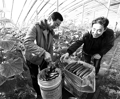 河北省保定市满城县大赛村积极发展无公害蔬菜种植,已建起蔬菜大棚500余亩,成为河北省无公害蔬菜示范基地,并成立了“富赛”果蔬合作社,注册了“蓝篮”牌商标。图为11月12日,大赛村菜农正在蔬菜大棚内采摘黄瓜。 本报记者 李景录摄