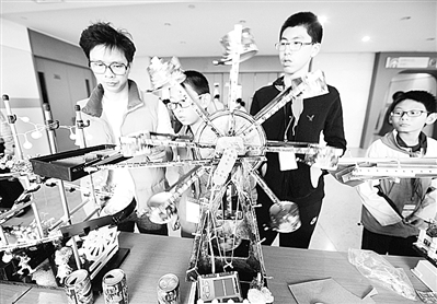 “2013杭州市中小学生科技节”机器人竞赛日前举行。图为一名学生将参加“生态家园建设”项目竞赛的机器人放入指定场地。新华社记者 李 忠摄