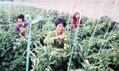 河北霸州京南桃园农业合作社工人在管理大棚里的西红柿。近年来,霸州市鼓励当地农民发展反季蔬菜种植供应京津市场,农民种植收入不断提高。