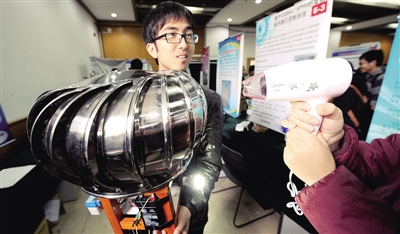 11月23日,来自东南大学吴健雄学院的参赛学生在演示其研制的“垂直轴风力发电、储能与照明装置”。当日,江苏省大学生物理及实验科技作品创新竞赛在南京东南大学举行,省内42所高校的学生选手携234项作品参加决赛并进行展示。 新华社记者 孙 参摄
