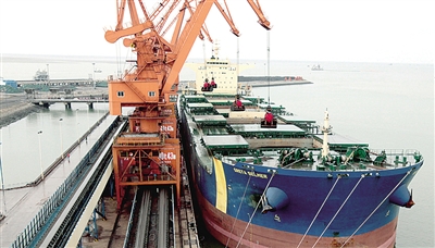 工人在辽宁丹东港码头进行吊装作业。丹东港年吞吐量已突破1亿吨。 本报记者 赵 晶摄