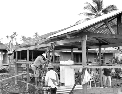 11月26日,在遭受台风“海燕”袭击的菲律宾中部莱特省阿布约市,居民整修被台风毁坏的房屋。 新华社发