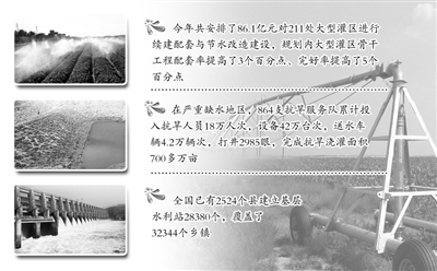 在农田水利建设领域,我国连续出台多项政策,保证建设资金持续投入。水利部农水司相关负责人介绍,今年共安排了86.1亿元对211处大型灌区进行续建配套与节水改造建设,规划内大型灌区骨干工程配套率提高了3个百分点、完好率提高了5个百分点。