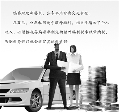 在瑞典和芬兰,由于没有高额税费,车辆购置付费远远低于丹麦和挪威,公车数量远较丹麦和挪威多,也在一定情况下允许私用。瑞典财政部要求,公车私用时要交足租金。在芬兰,公车私用属于额外福利,相当于增加了个人收入,必须按税务局每年制定的额外福利税率照章纳税,否则税务部门就会追究其逃税责任。对于私用不报告的,税务和司法部门在得到举报后就会介入。