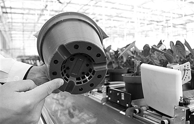 北京市农业机械研究所京鹏智慧温室日前在通州区投入科研运营。这个总面积达3024平方米的智慧温室,能够进行工厂化种苗繁育,进行低碳节能、精准远程控制等农业高新技术试验展示。图为工作人员手指花盆底部微凸处,这里嵌有记录盆花各项指标的RFID芯片。 新华社记者 李 敏摄