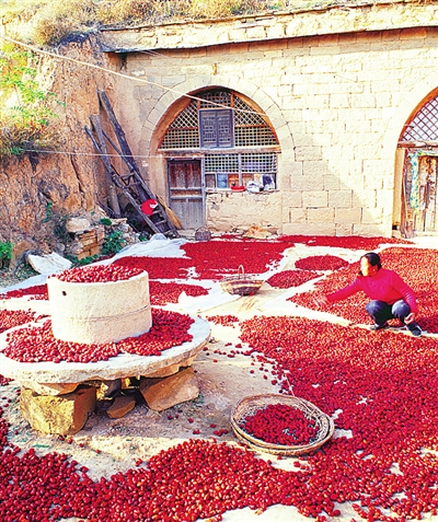 延安的农户在晾晒红枣。红枣是延安黄河沿岸各县区农民增收致富的主导产业之一。 王学锋摄(资料图片)