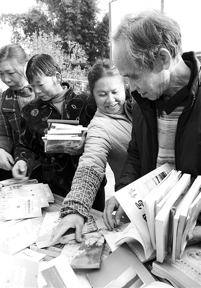 左图 四川华蓥市阳和镇祝家坝村的村民,在村头选取“背篼法律图书馆”刚送来的图书。