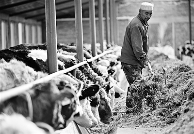 彭阳县古城镇一家肉牛养殖园区的工人在给牛添加饲草。近年来,地处黄土高原的宁夏回族自治区彭阳县依托生态优势,采取“以奖代补”政策推动草畜产业发展,对养殖大户以及新建规模以上养殖场进行政策资金奖励。 新华社记者 王 鹏摄