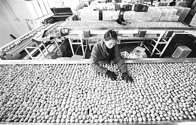 南丰县昊然果品销售专业合作社工人在分选蜜橘(12月5日摄)。江西南丰县政府引导橘农分批采摘、分级包装,蜜橘销售红红火火,果农收入大幅增加,走出了“量大价贱伤农”怪圈。 新华社记者 周 科摄