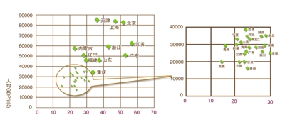 一个地区的创新能力与该地区的经济发展、居民收入及教育水平有着密切关系。2011年,人均GDP排名前10名依次是天津、上海、北京、江苏、浙江、内蒙古、广东、辽宁、福建和山东,6岁以6岁以上人口中大专及以上学历所占的比例排名前10名也主要是这些地区,除了个别地区外,这些省区市的创新能力排名均位居前列,呈现出较高的重合性。
