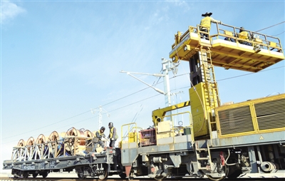 12月12日,兰州铁路局嘉峪关供电段组织施工单位对嘉峪关至玉门段架设接触网线。